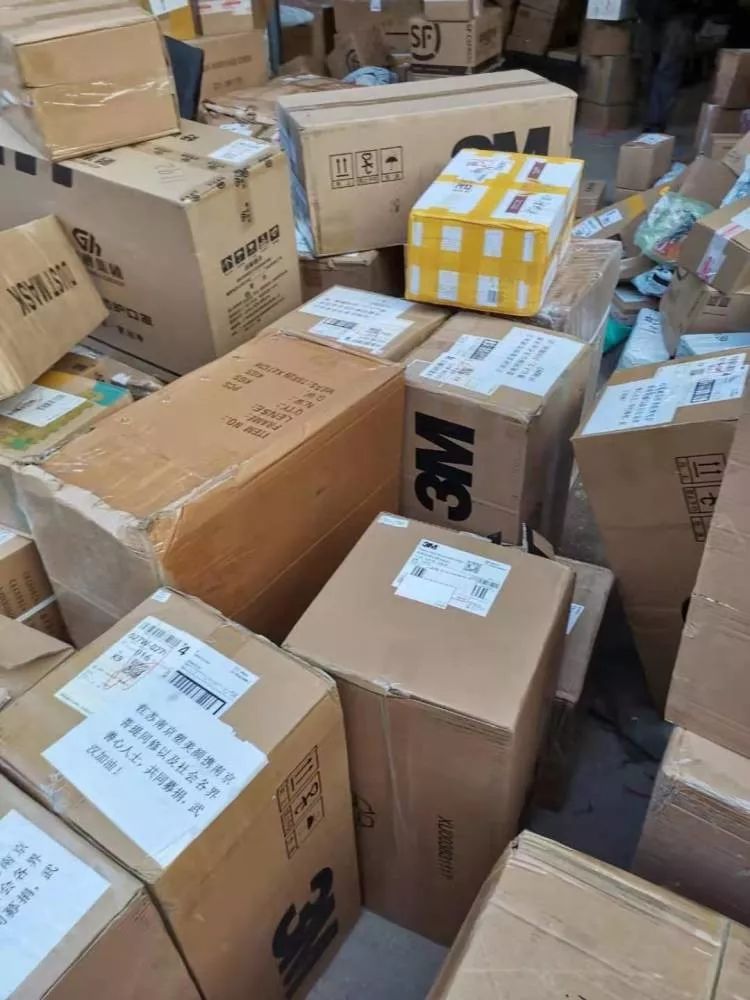 在這家快遞點(diǎn)內(nèi),地面堆放著數(shù)十個(gè)大小不一的紙盒,全是送往五醫(yī)院的快遞。 這些快遞基本上都是社會(huì)愛心人士向醫(yī)院捐贈(zèng)的醫(yī)護(hù)用品,包括口罩、護(hù)目鏡、頭套、鞋套等。 五醫(yī)院工作人員介紹,近段時(shí)間,他們每天都會(huì)收到大量捐贈(zèng)的醫(yī)護(hù)用品。